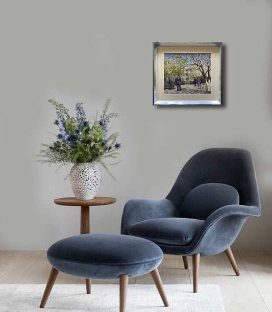 Stadtbild mit Regenbogensprenkeln im Springbrunnen. 1986.