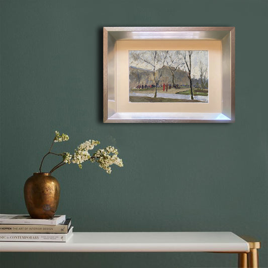 Frühlingslandschaft mit blühenden Bäumen in der Stadt. 1962.