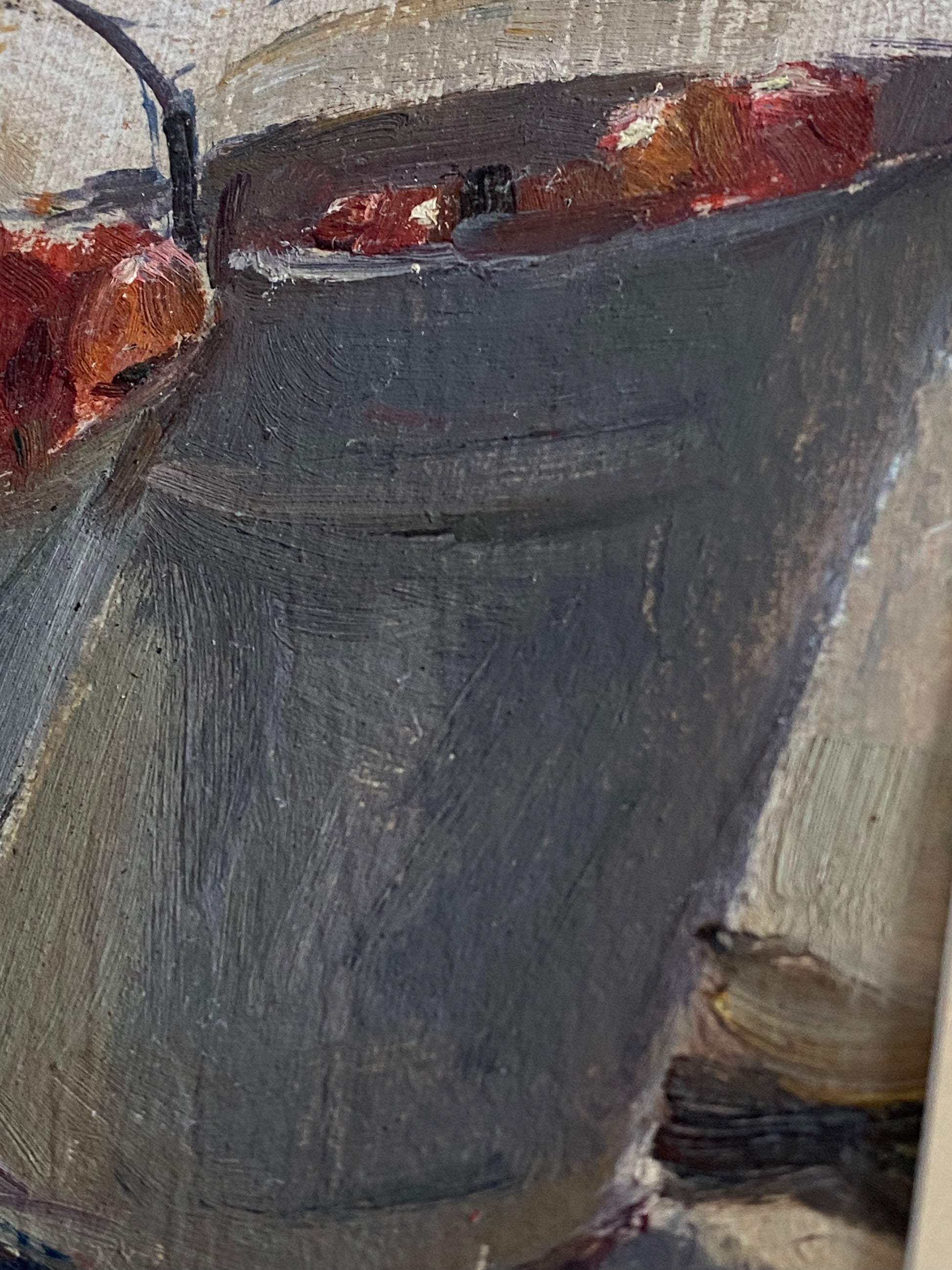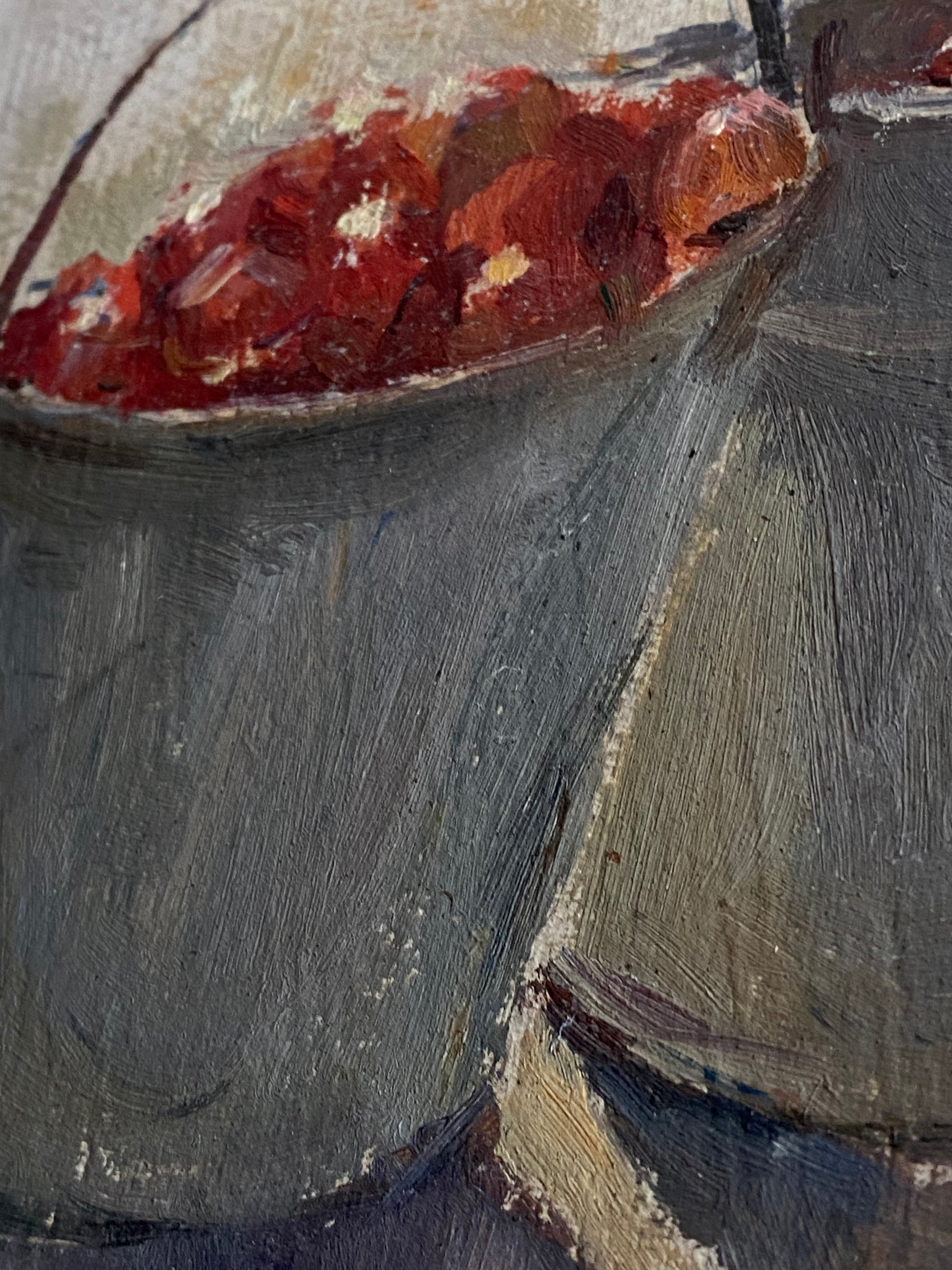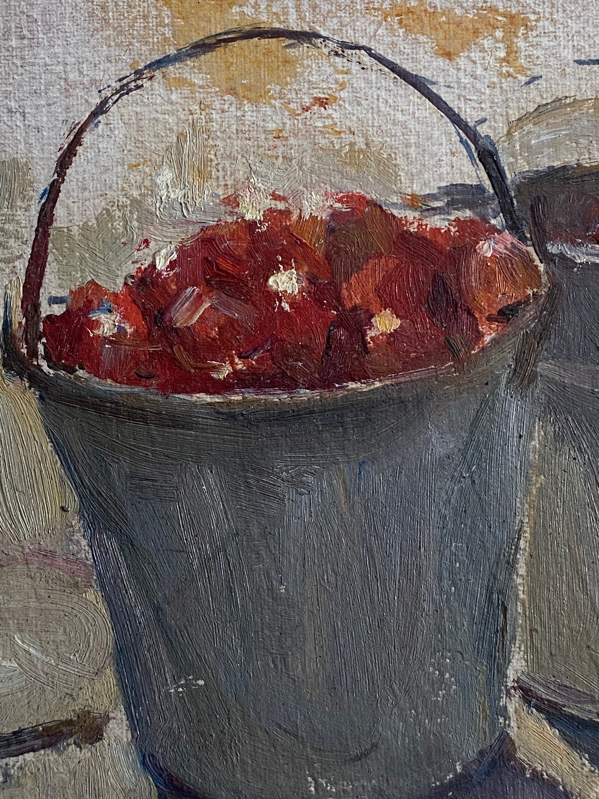Original-Vintage-Ölgemälde eines unbekannten ukrainischen Künstlers. Dieses charmante Stillleben zeigt zwei Metalleimer, gefüllt mit leuchtend roten Beeren, wahrscheinlich Kirschen oder ähnlichen Sommerfrüchten. Das Werk ist in einem lockeren, ausdrucksstarken Stil gemalt, der typisch für die ukrainische Kunst der Mitte des 20. Jahrhunderts ist.