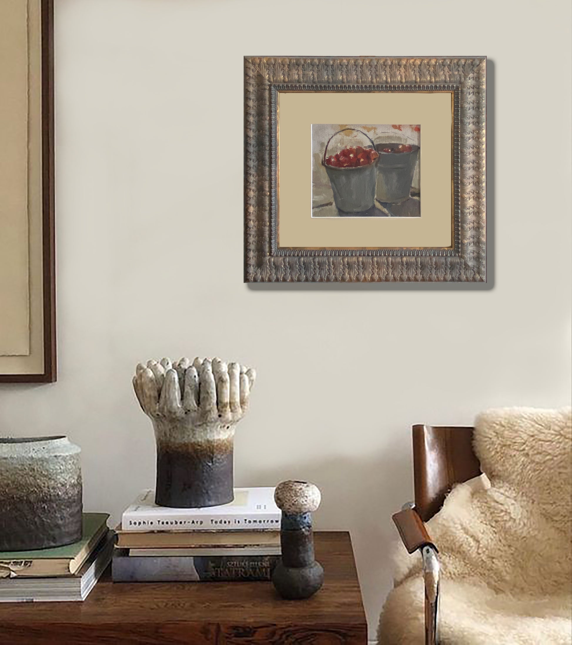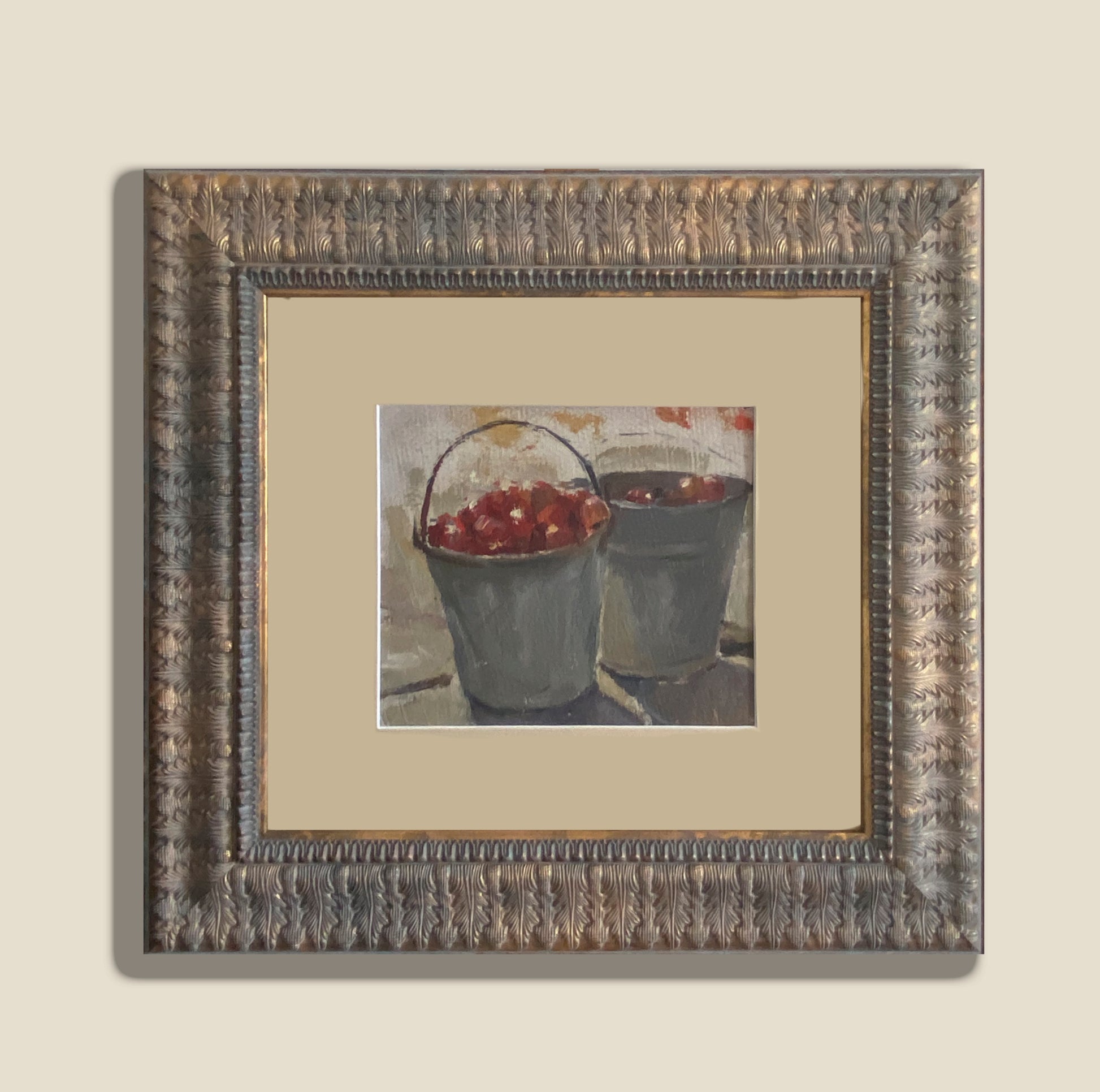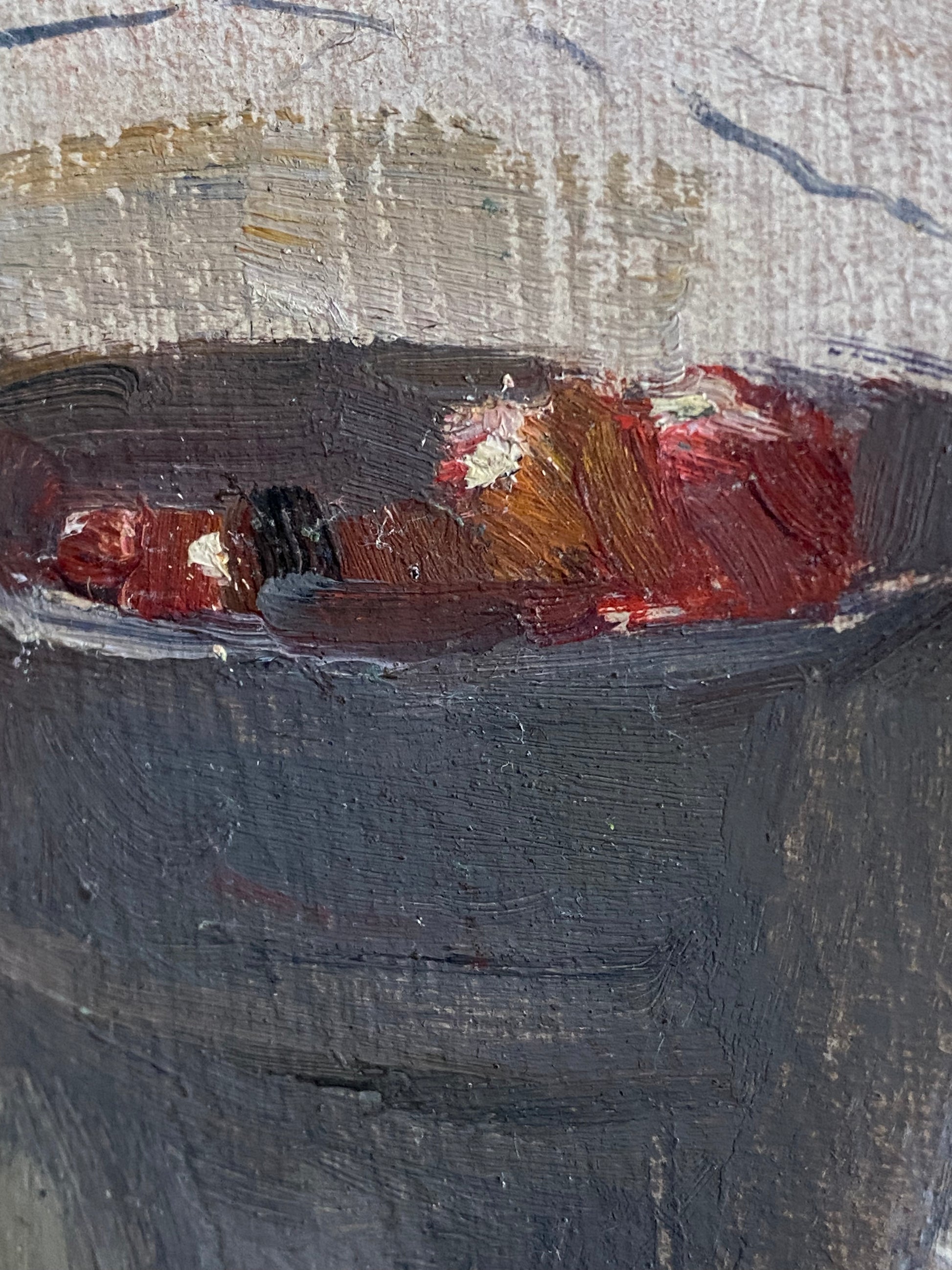 Original-Vintage-Ölgemälde eines unbekannten ukrainischen Künstlers. Dieses charmante Stillleben zeigt zwei Metalleimer, gefüllt mit leuchtend roten Beeren, wahrscheinlich Kirschen oder ähnlichen Sommerfrüchten. Das Werk ist in einem lockeren, ausdrucksstarken Stil gemalt, der typisch für die ukrainische Kunst der Mitte des 20. Jahrhunderts ist.