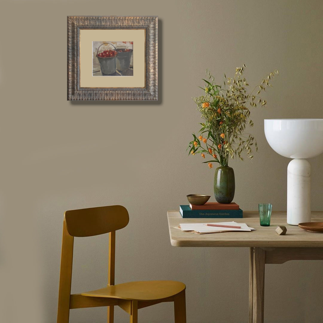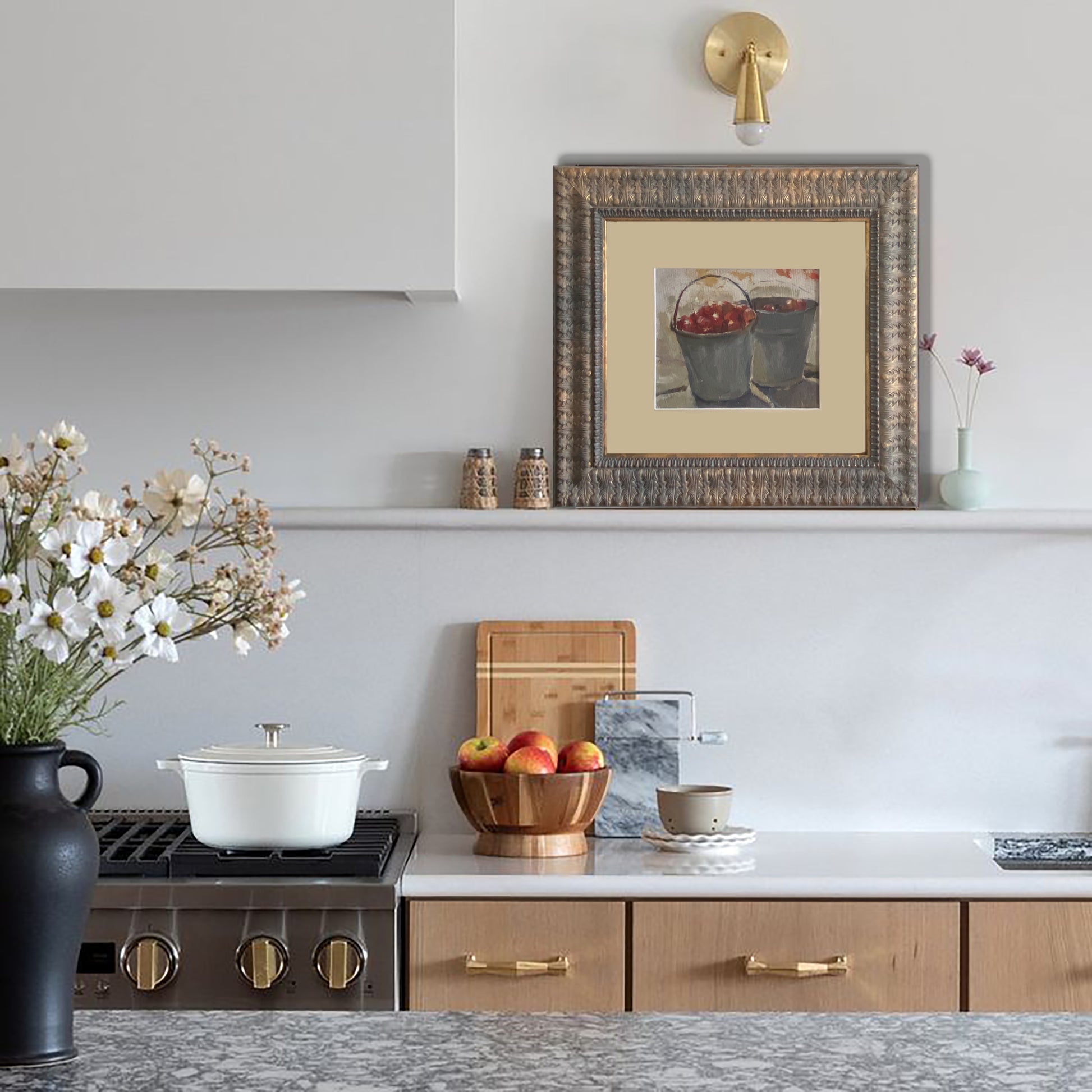 Das Gemälde ist in einem schönen, verzierten Rahmen gefasst, der seinen rustikalen Charme unterstreicht. Dieses einzigartige Kunstwerk ist perfekt, um Ihrer Küche, Ihrem Esszimmer oder Ihrem Wohnbereich einen Vintage-Charakter und Wärme zu verleihen.