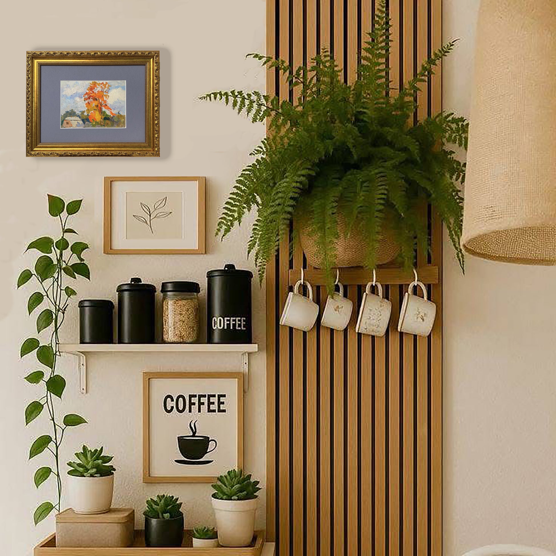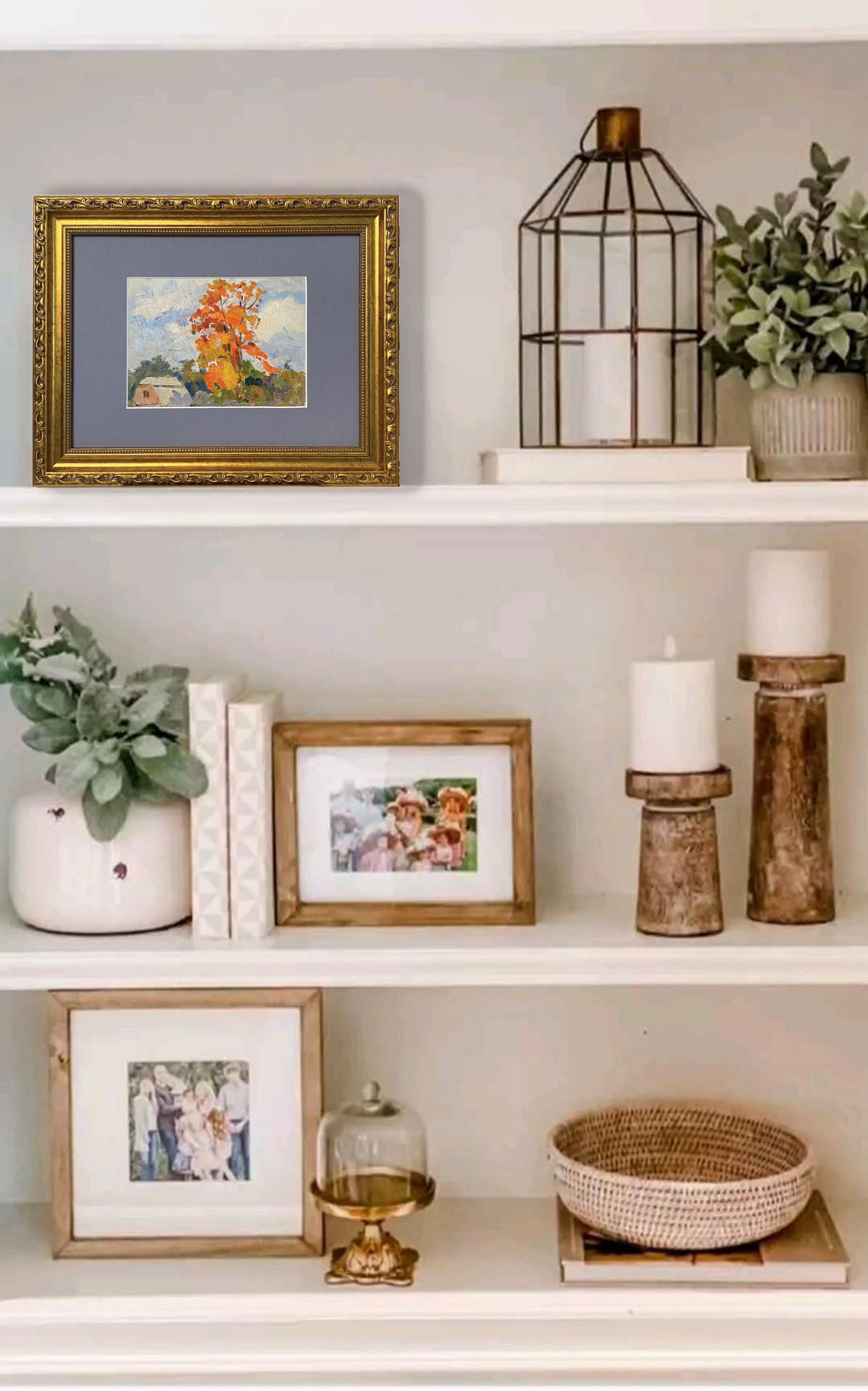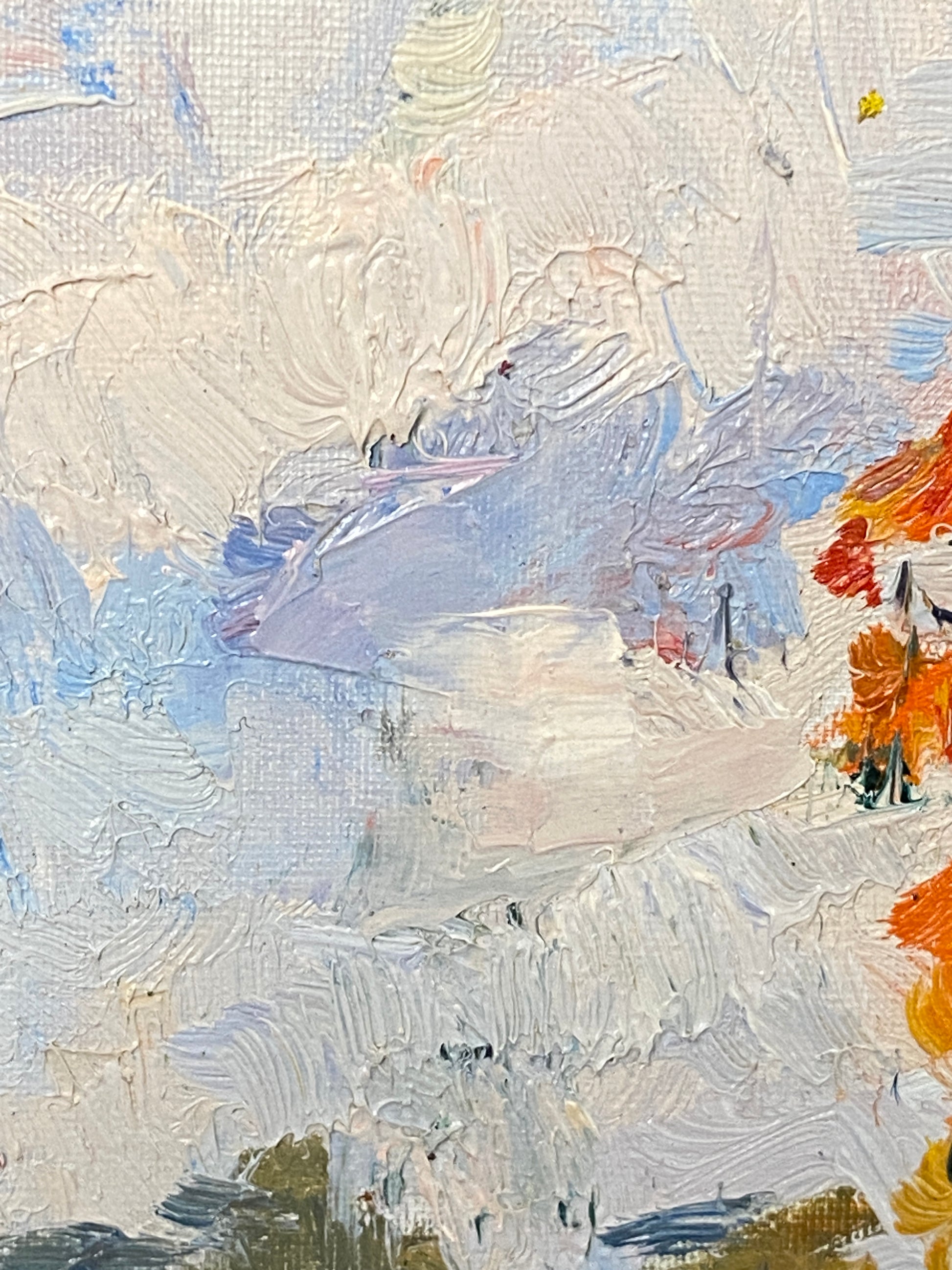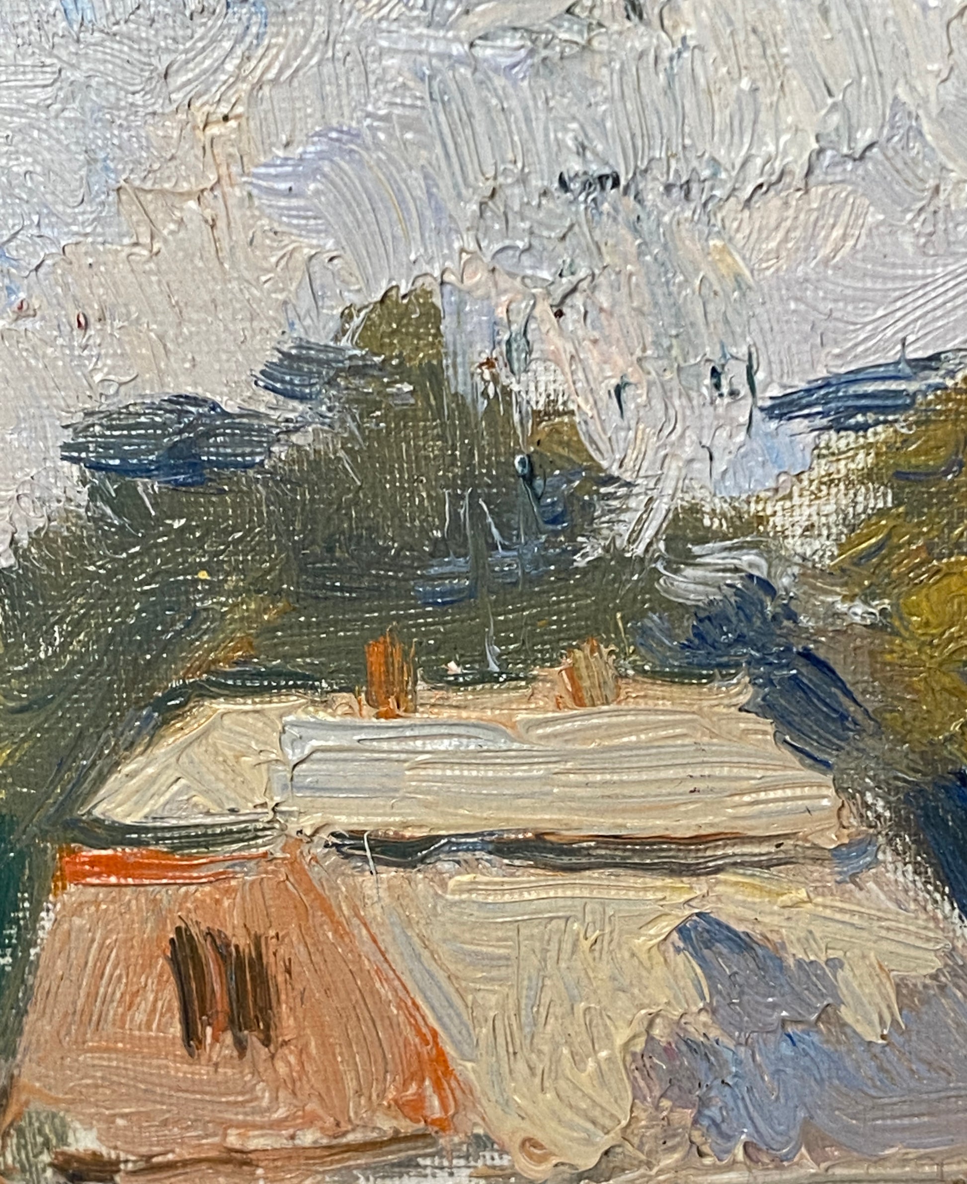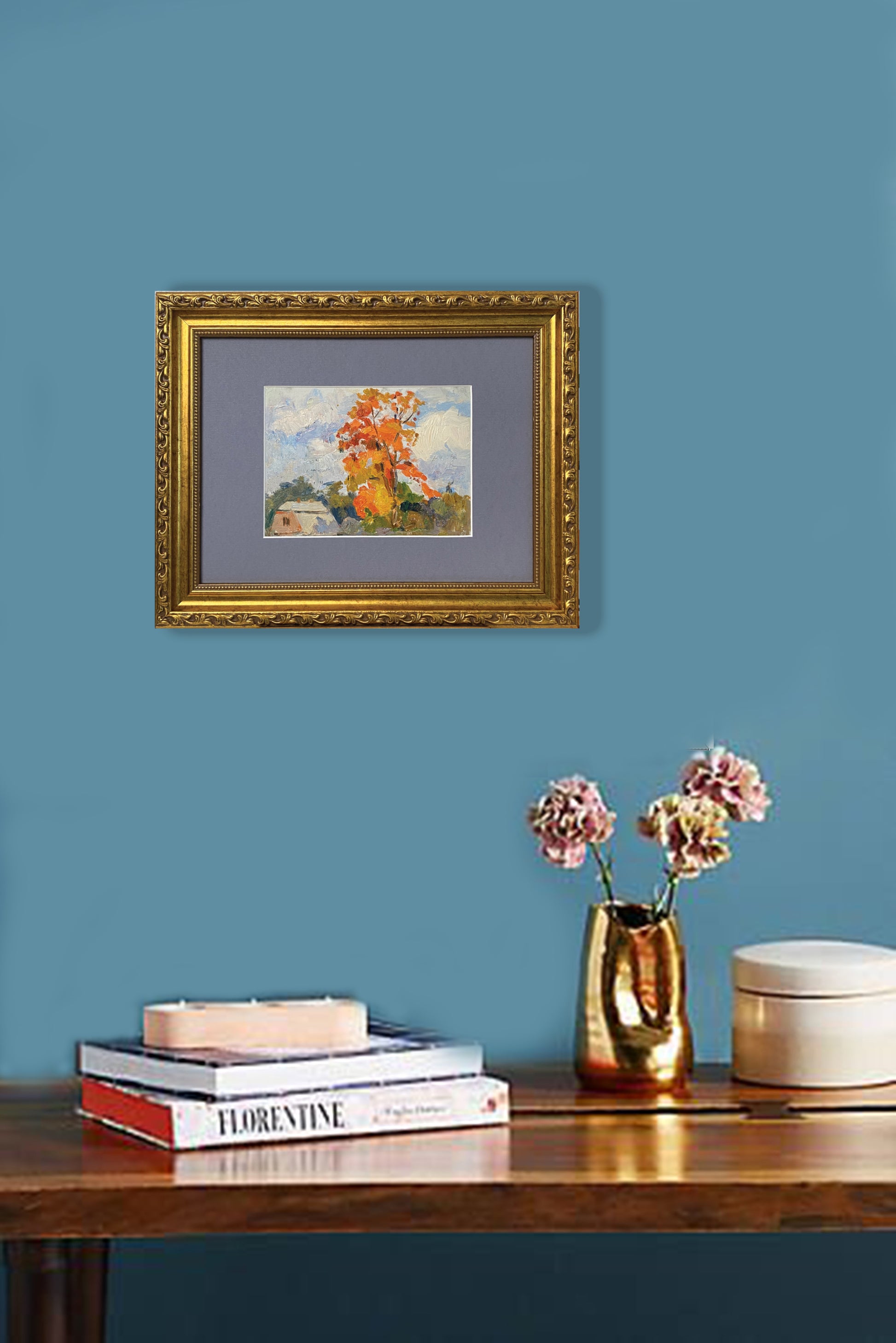 Dieses Vintage-Kunstwerk zeigt einen lebhaften Herbstbaum in leuchtenden Orange- und Gelbtönen, der einen Kontrast zu dem ruhigen Himmel und den ländlichen Häusern bildet. Das mit Öl auf Karton gemalte Bild fängt mit ausdrucksstarken Pinselstrichen die Wärme und Nostalgie der Jahreszeit ein.