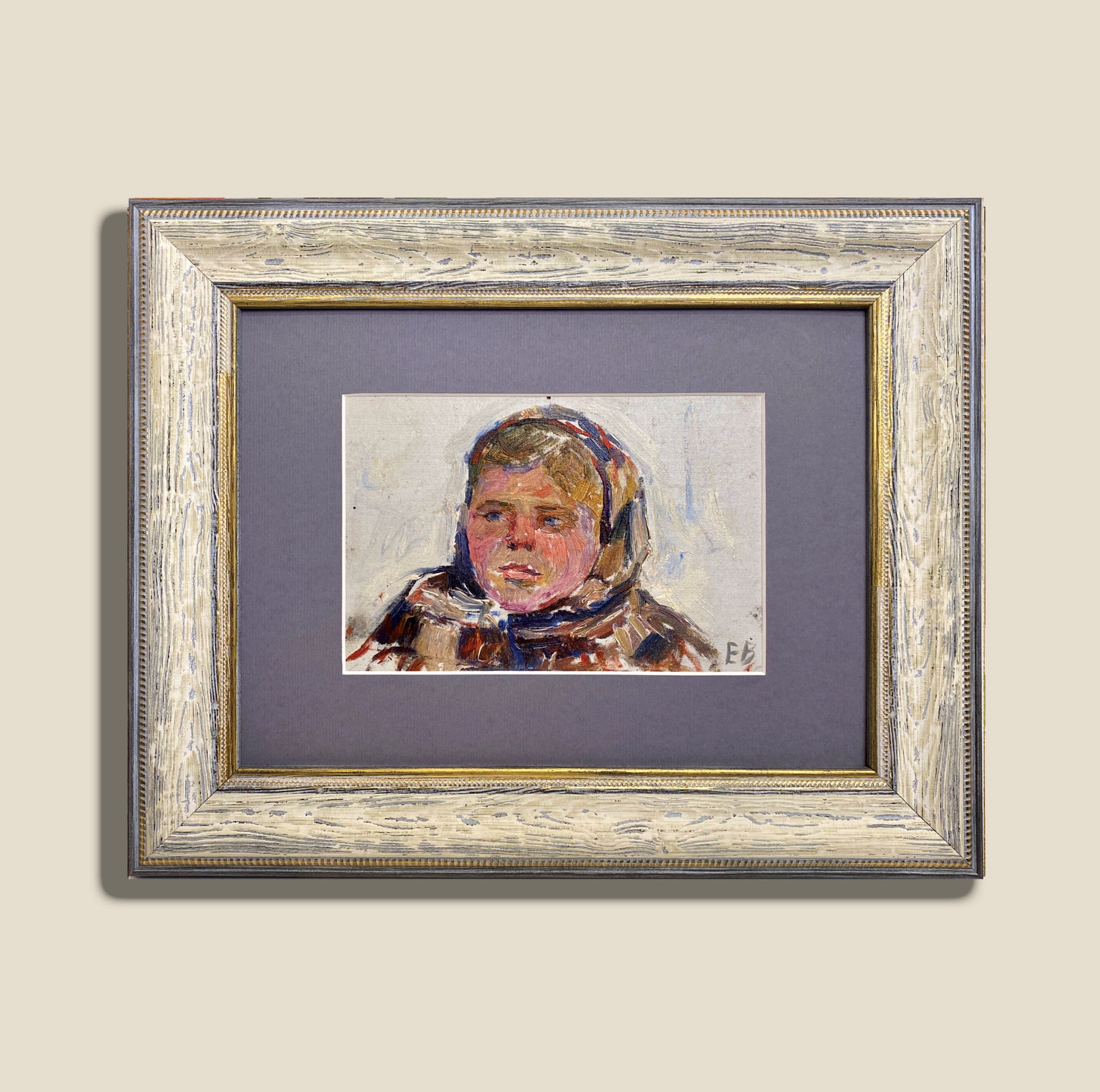 Originales Vintage-Porträt eines jungen ukrainischen Mädchens mit traditionellem Kopftuch, gemalt vom Künstler Evgen Volobuev in den 1970er Jahren. Dieses ausdrucksstarke Ölgemälde auf Karton fängt einen Moment stiller Introspektion mit reicher Pinselführung und kräftigen, gefühlvollen Farben ein. Gerahmt in einem schlichten Holzrahmen, strahlt es Authentizität und kulturelle Wärme aus.