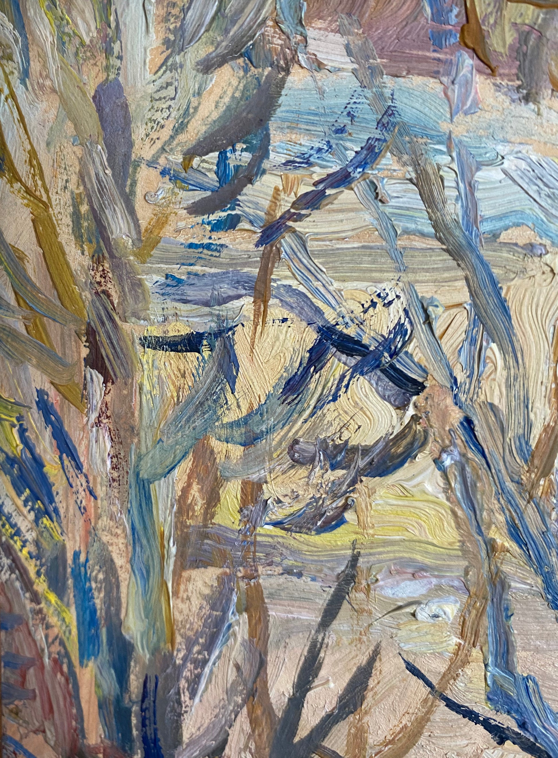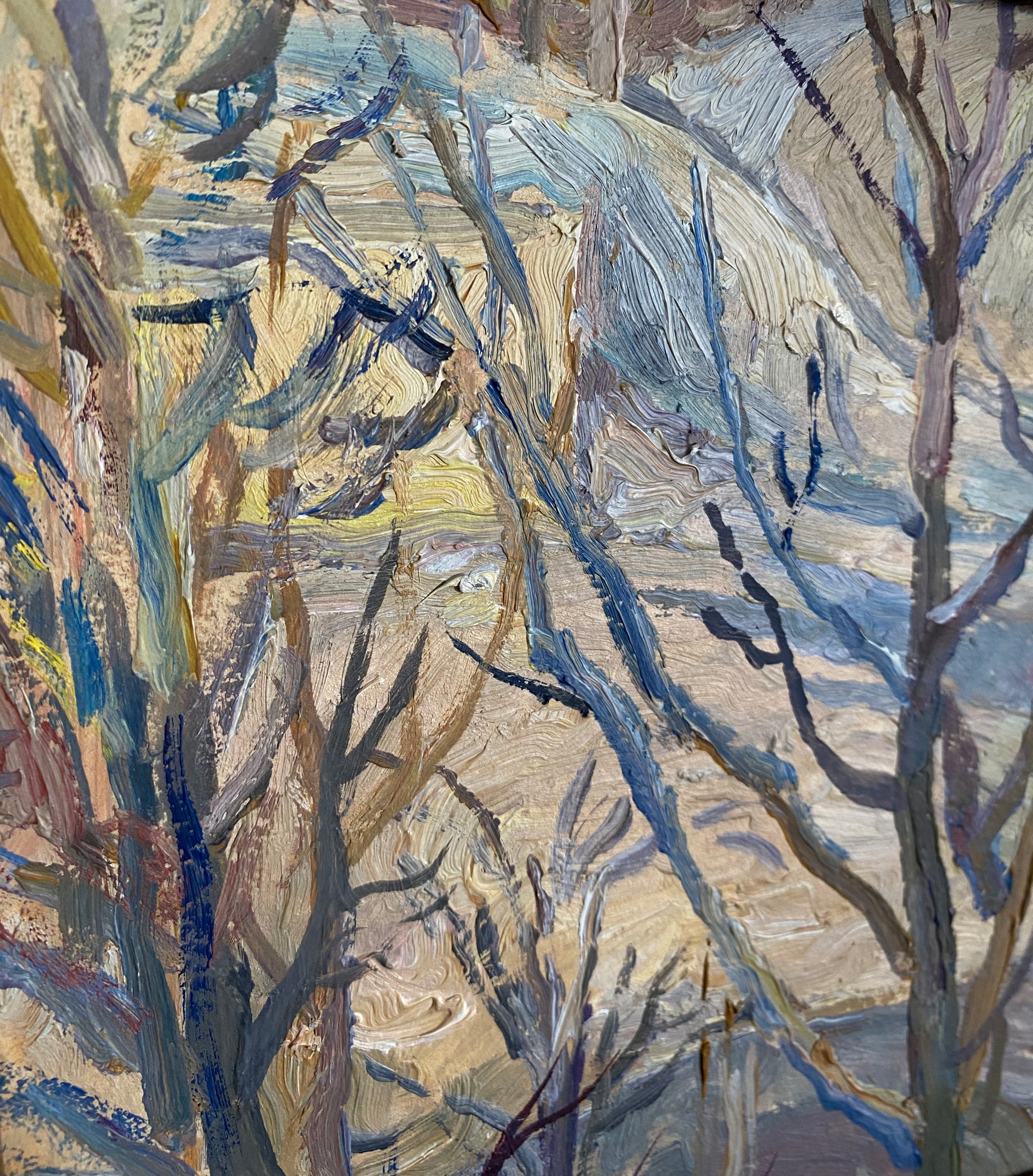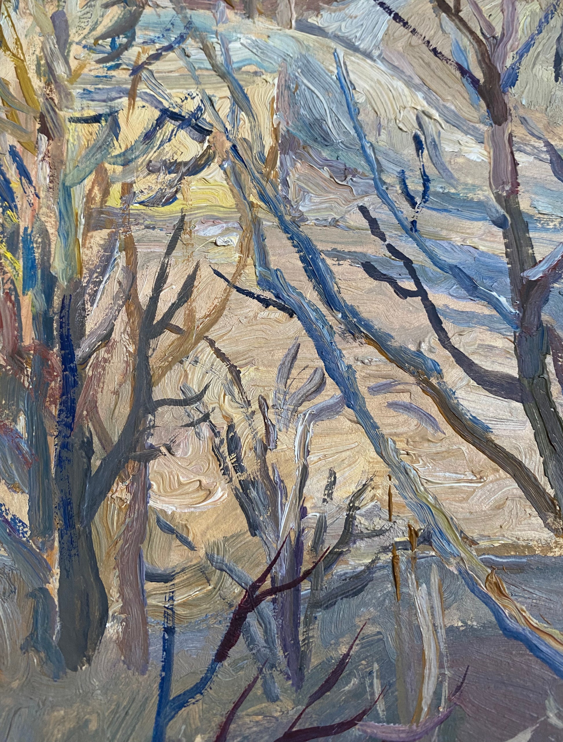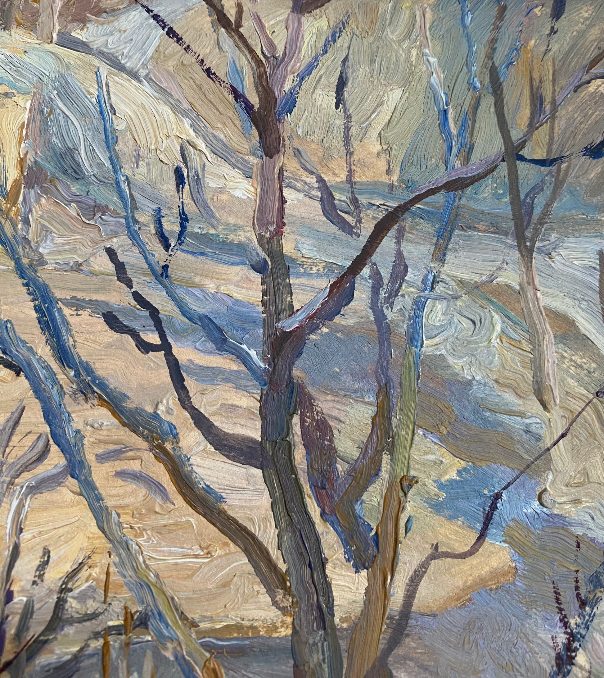 Diese stimmungsvolle Winterlandschaft zeigt einen ruhigen, verschneiten Weg, umgeben von kahlen Bäumen, dargestellt mit ausdrucksstarken Pinselstrichen und einer sanften, zurückhaltenden Farbpalette. Die Szene vermittelt Ruhe, Stille und die natürliche Schönheit des Winters.